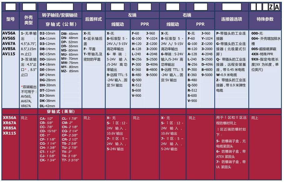 Avtron AV85,AV56 和AV67 SMARTach Ⅱ編碼器,和帶自診斷LED的連接器選項(xiàng)"P"。